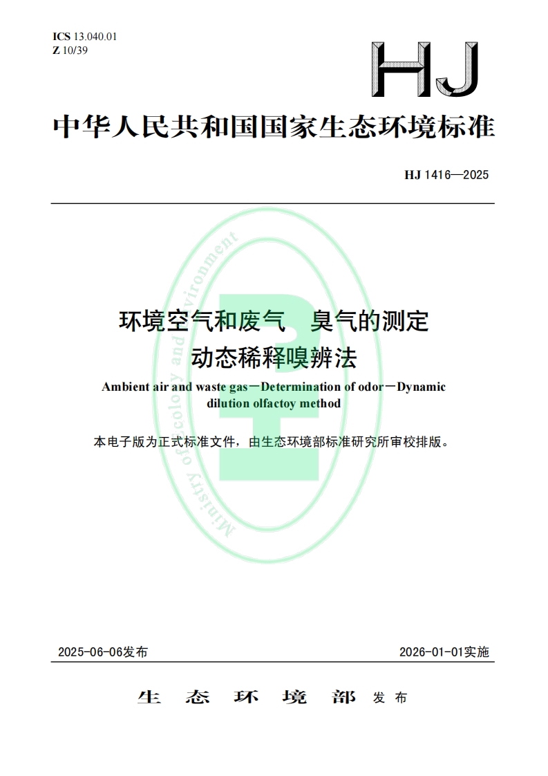 为规范环境空气和废气中臭气的测定方法,生态环境部近日发布了国家生态环境标准《环境空气和废气 臭气的测定 动态稀释嗅辨法(HJ 1416—2025)》。本标准为首次发布,自2026年1月1日起实施。