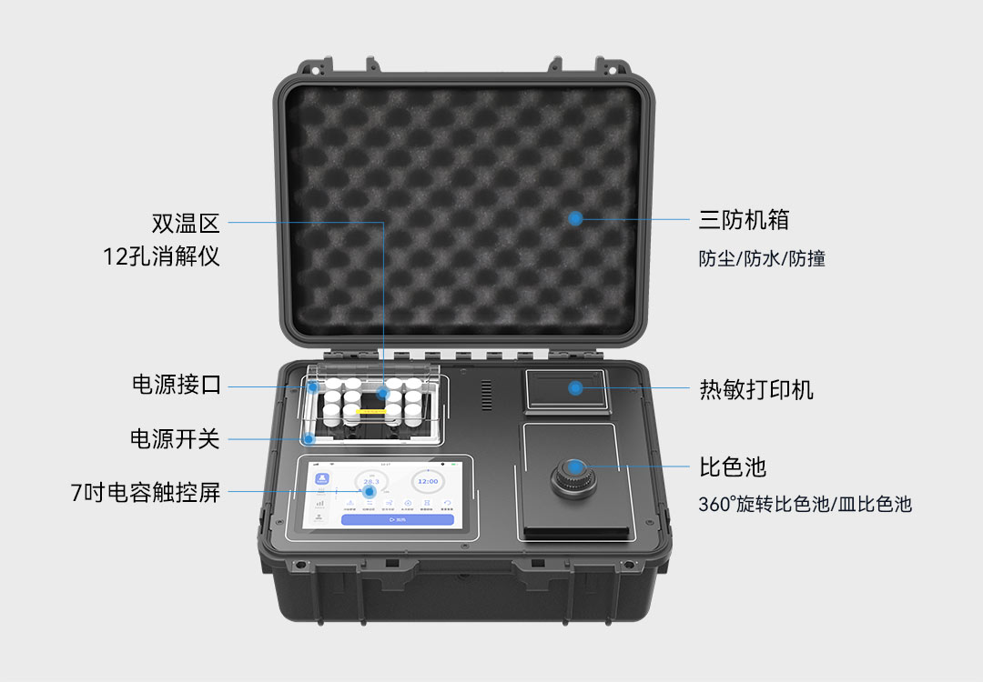 双便携箱设计,为户外水质检测提供了强大的户外应用支持,该仪器具备双温区消解功能,6+6孔双温区设计,可以满足多指标消解的需求。此外,仪器还内置了大容量锂电池,综合工况下工作续航能力长达8小时,为户外长时间使用提供了强有力的支持。