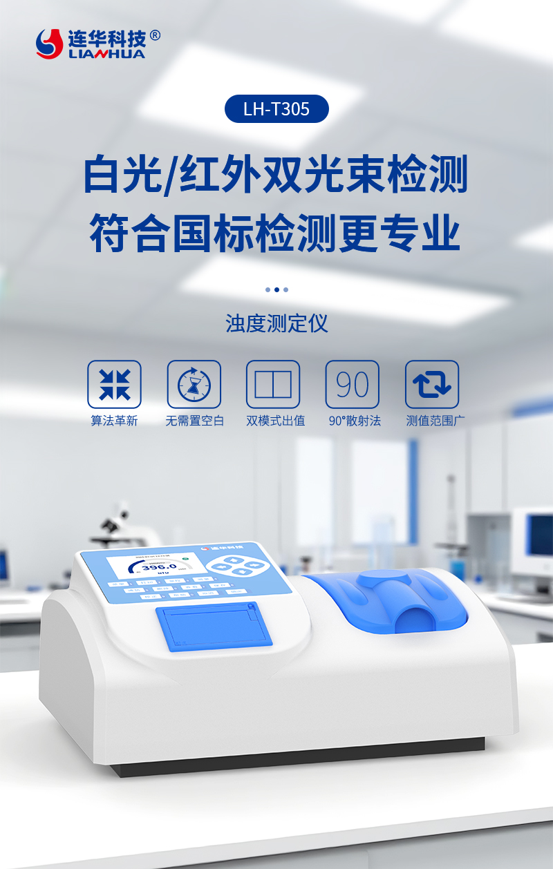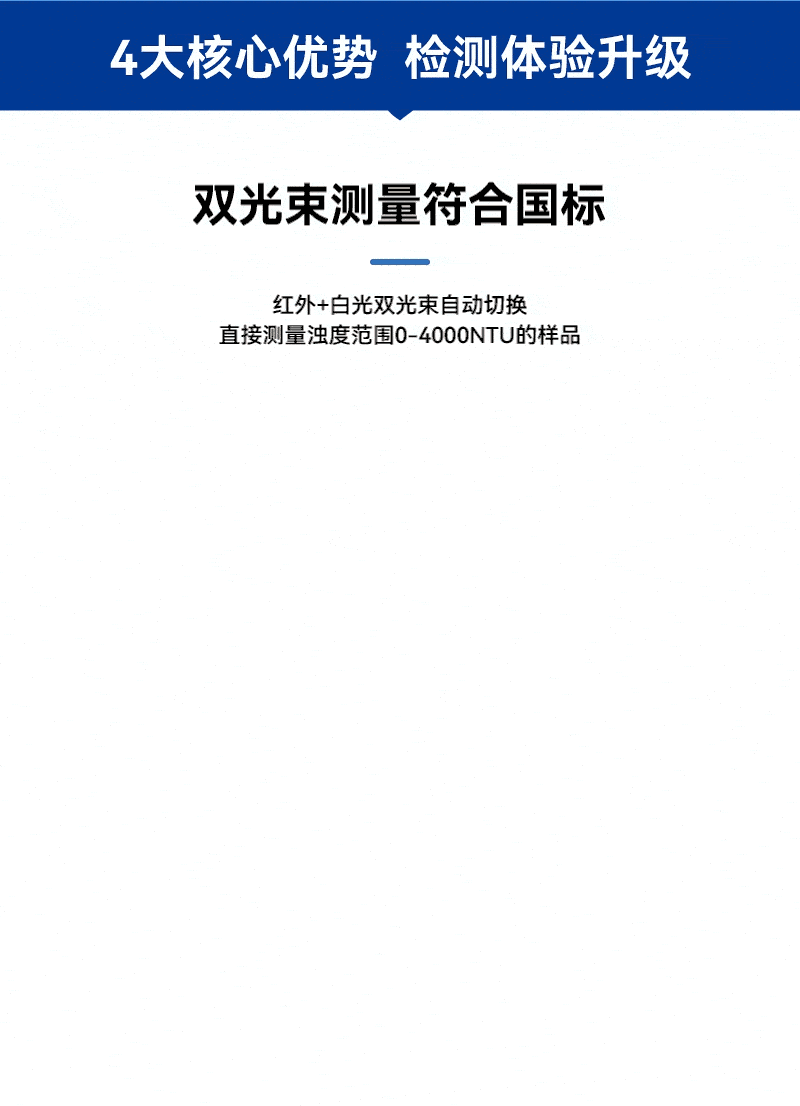 2、白光+红外双光束自动切换,可直接测量浊度范围0-4000NTU的样品;