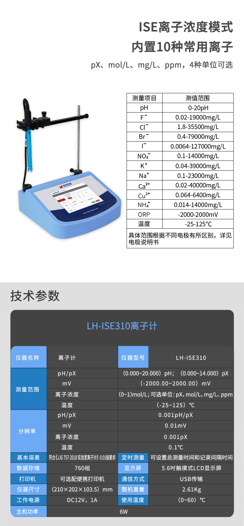 8、ISE离子浓度模式:ISE离子浓度模式内置10种常用离子,可自定义其他离子;pX、mol/L、mg/L、ppm,4种单位可选
