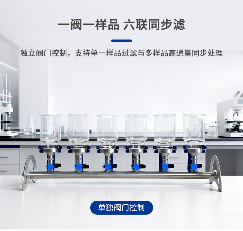 3、每个样品配单独阀门控制,可单独过滤一个样品,亦可同时过滤多个样品;