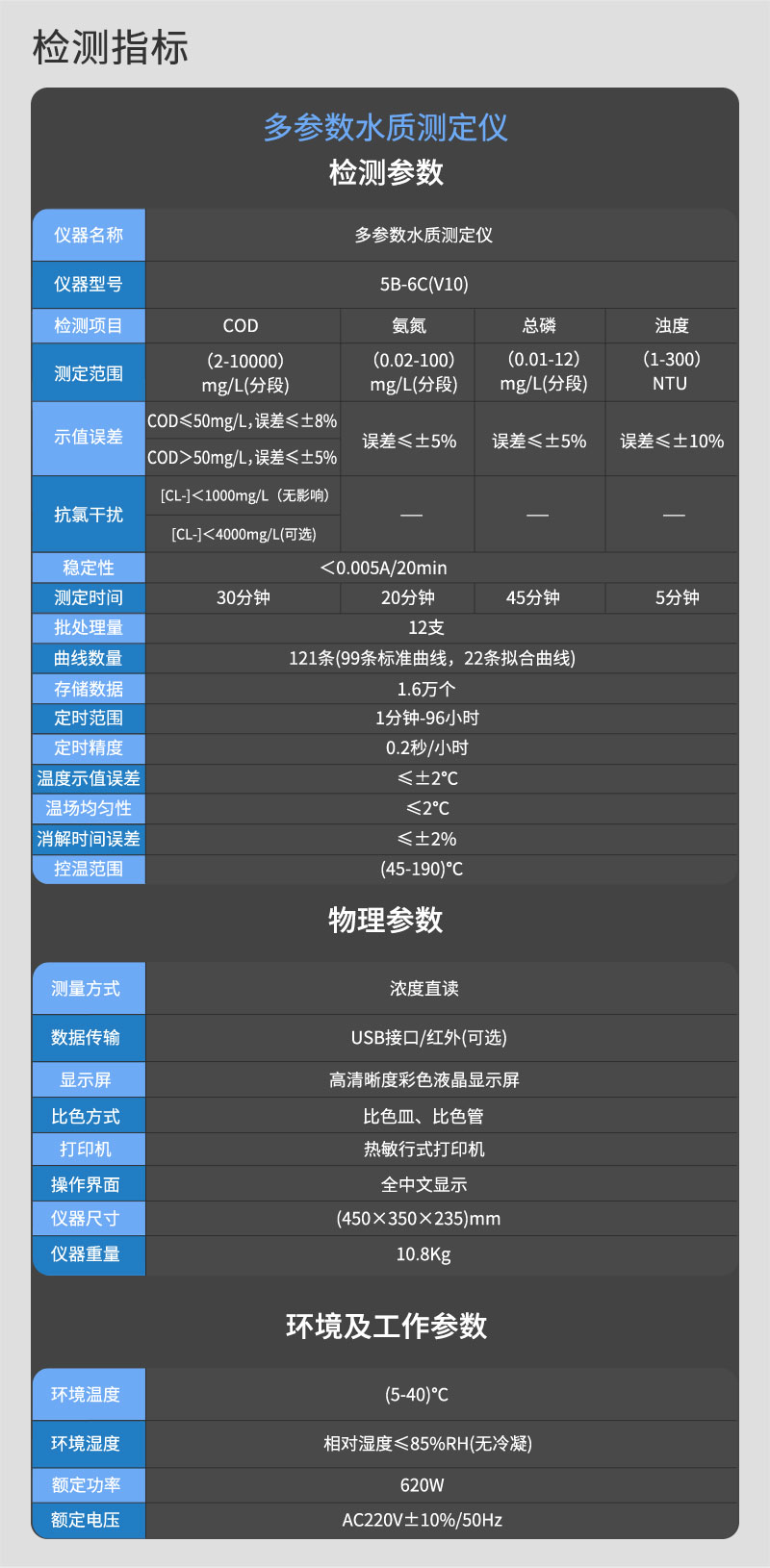 5B-6C(V10)多参数水质测定仪在稳定性、准确性、测定范围、多功能、实用简便性等多方面实现了质的提升,具有很高的性价比,可测定COD、氨氮、总磷、浊度四个指标。